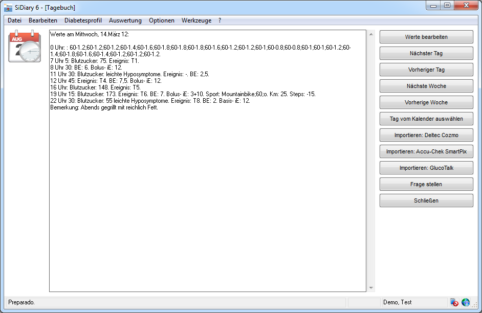 Auch das Importieren der für Blinde geeigneten Geräte ist selbstverständlich möglich! SiDiary unterstützt diverse Geräte zur Blutzucker- und Blutdruckmessung bzw. Tagebuchführung: ProGen GlucoTalk, CareTec GlukiDoc, Accu-Chek Voicemate Plus, Accu-Chek Compact Plus, CareTec SweetHeart, Sensocard, Sensocard Plus, Sensolite Nova, Sensolite Nova Plus). Der Geräte-Treiber zur Datenübernahme aus der CoZmanager-Software für die Deltec Cozmo Insulinpumpe runden das Bild ab, sodass auch Daten aus dieser derzeit für blinde Pumpenträger einzigen sinnvoll nutzbaren Insulinpumpe übernommen werden können. Aber auch die Accu-Chek Insulinpumpen D-Tron Plus und Spirit können mit der Smartpix-Kommunikationsbox ausgelesen werden.