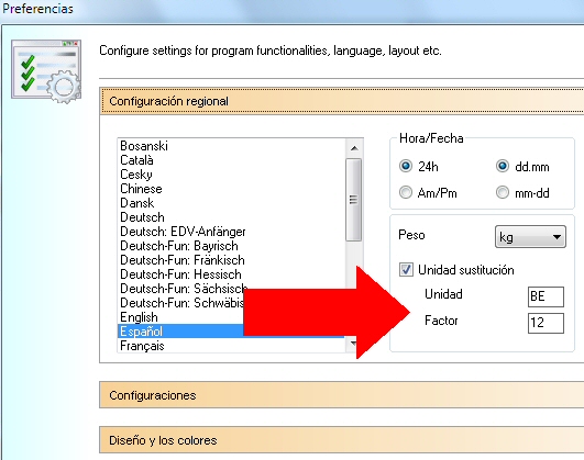 En caso de que prefieras otras equivalencias como por ejemplo, 10 g de Carbohidratos por 1 KE ó 12 g por 1 BE, puedes cambiar el valor de la 'Unidad Equivalencia' en el Menú 'Extras -> Configuración Configuración Idioma':