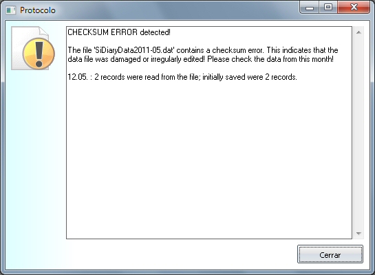 Si el archivo es modificado o dañado (por ejemplo, por la pérdida de electricidad, una falla del disco duro, el apagar la computadora mientras se están guardando los datos, etc.) y la suma de verificación ya no coincide, SiDiary reportará esto (junto con los días que tienen datos cambiados) para alertarte sobre datos erroneos. (Ver figura)