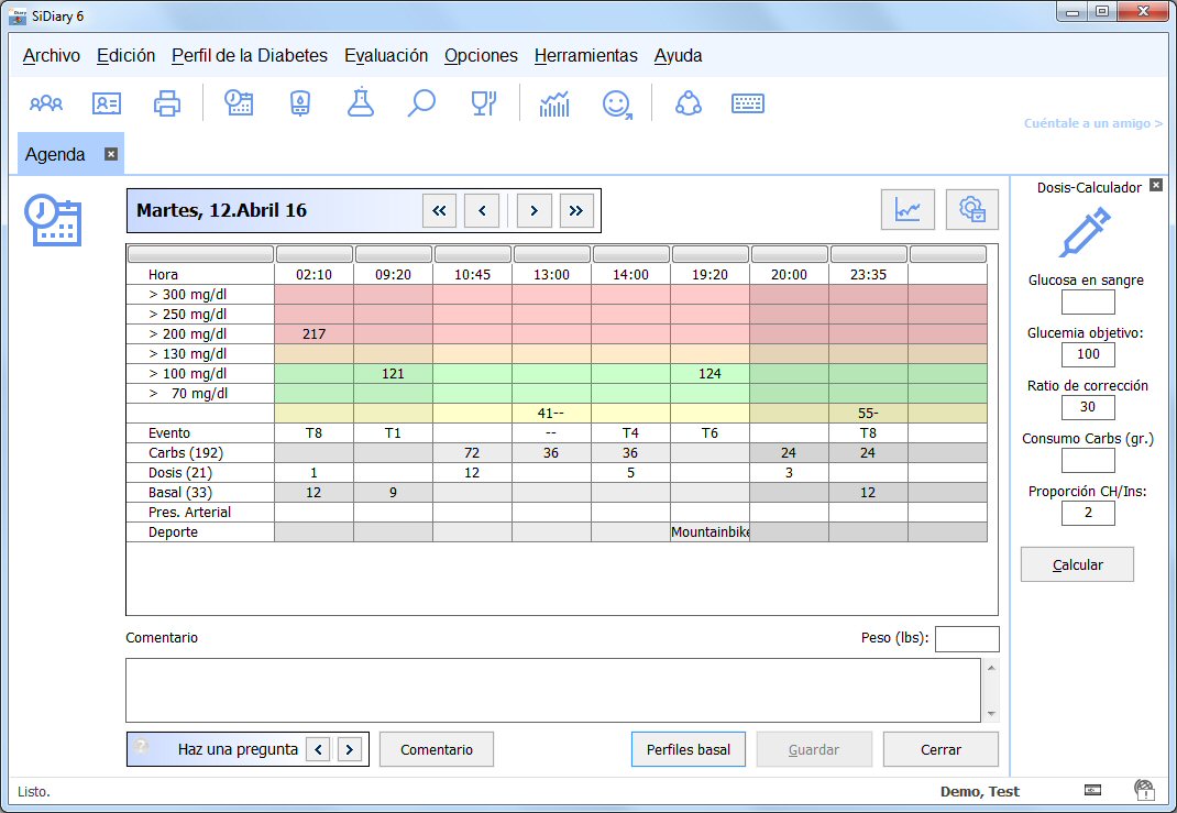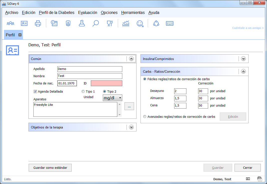 Diabetes-Software SiDiary Algunas funcionalidades (por ejemplo, dosis sugerida) necesitan un perfil de configuración de diabetes, que puedes configurar en la tabla de perfil o dentro de la pantalla de perfil. Encontrarás más abajo, información sobre como entrar las equivalencias (ratios) correctas y las reglas de corrección.