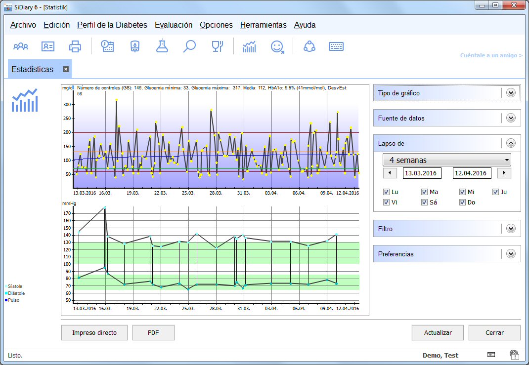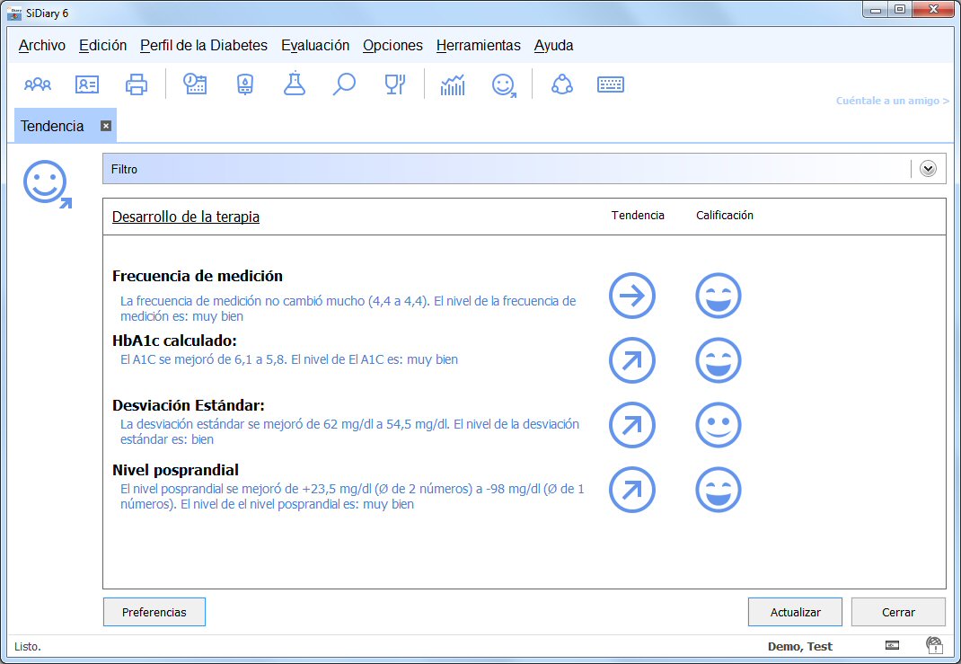 Diabetes-Software SiDiary Cuando has entrado varias lecturas, puedes utilizar la función de diagnosis para una valoración y tendencia de tu situación actual. Puedes seleccionar el rango de tiempo y obtendrás los resultados mediante el botón de 'Refrescar'. Obviamente los resultados serán mejores con más datos introducidos! Los valores límites para la valoración pueden ser predefinidos con tus ajustes individuales (botón de ajustes) y adicionalmente puedes seguir tus resultados de laboratorio (A1C, parámetros del riñón, etc.) en esta tabla con el botón de resultados de laboratorio.