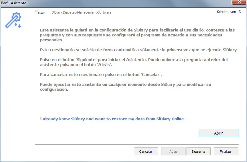 Diabetes-Software SiDiary Cuando has iniciado SiDiary por primera vez, mostrará la pantalla de perfil. Esta herramienta, te hará una serie de preguntas relacionadas con la Diabetes y de tus respuestas configurará el programa de acuerdo con tus necesidades individuales.