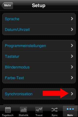 In der iPhone-App klicken Sie bitte unten auf 'Mehr >>Einstellungen >>Synchronisation'