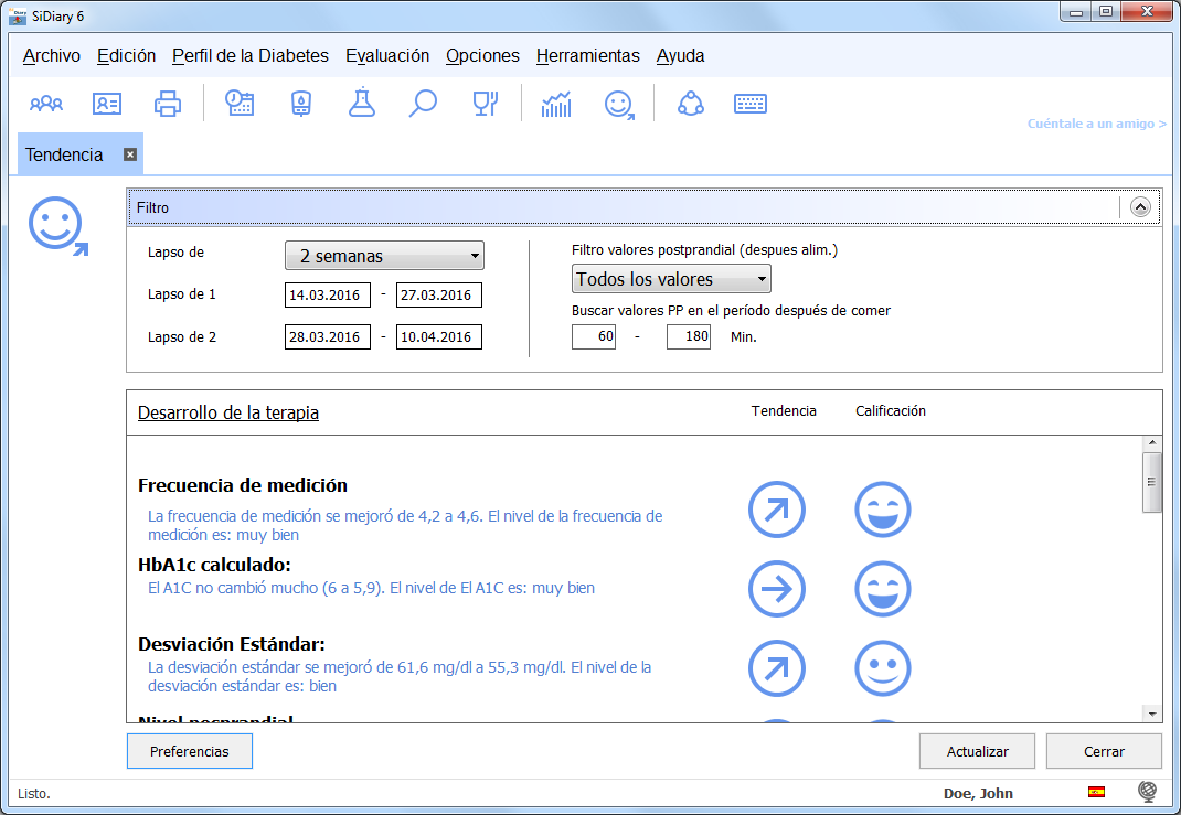SiDiary incluso incrementará la motivación del niño en la constante batalla contra la diabetes. Esta es la razón para incluir un análisis de tendencia con un interfície de emoticons. Con la capacidad de configurar los parámetros importantes se puede predefinir cuales son los rangos excelentes, buenos, aceptables o inaceptables para tus hijos.
