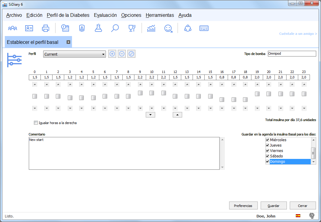 SiDiary puede manejar un número ilimitado de perfiles basales. Esto es interesante en personas que tienen distintos requisitos los días de trabajo y los fines de semana. Puedes asignar tu perfil basal a los días de trabajo y SiDiary insertará automáticamente, la suma de esos días a tu registro diario como valores por defecto (esto puede ser cambiado).