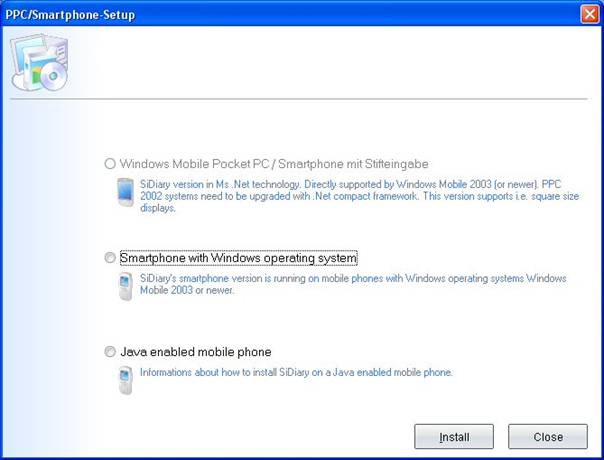 You can start the setup 'SiDiary for mobiles' either in the SiDiary program group or directly in the program (in the menu File → Install mobile devices). A wizard is guiding you through the setup, and you are able to use the standard setting options, for example the target setup folder.