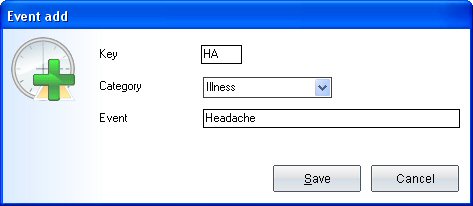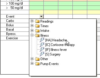In the screen Events you can edit events and relate them to data records that you already entered in your logbook. SiDiary provides several standard events that you can adjust as you like. You can also edit the categories.