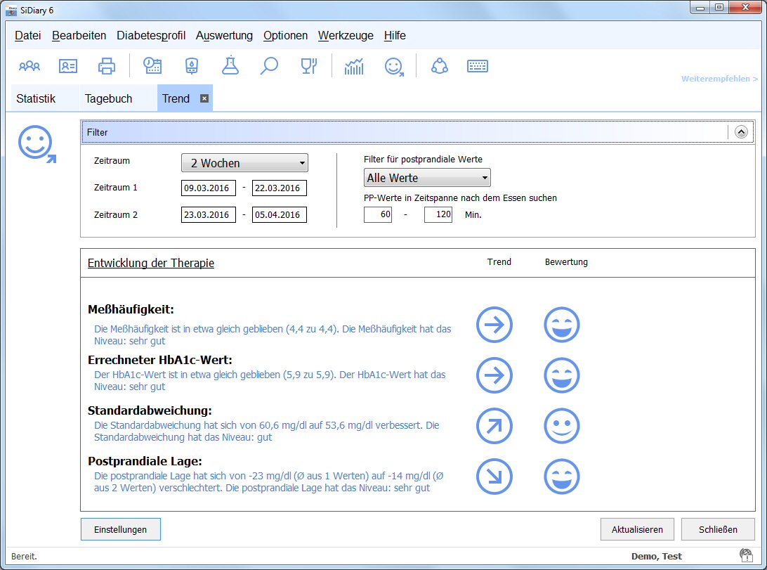 SiDiary Trendanalyse Wenn Sie die ersten Werte erfasst haben, können Sie diese mit der Analysefunktion bewerten und einen Trend anzeigen lassen. Wechseln Sie auf die entsprechende Karteikarte und klicken Sie ggf. auf Aktualisieren. Diese Funktion setzt natürlich eine gewisse Anzahl an Daten voraus und wird mit der Menge der eingegebenen Daten immer aussagekräftiger! Die Grenzwerte für die Beurteilung Ihrer Werte können Sie individuell an Ihre Anforderungen anpassen (Taste "Einstellungen"). Zusätzlich können Sie im Programm all Ihre Laborwerte erfassen und protokollieren (HbA1c-, Nierenwerte usw.).