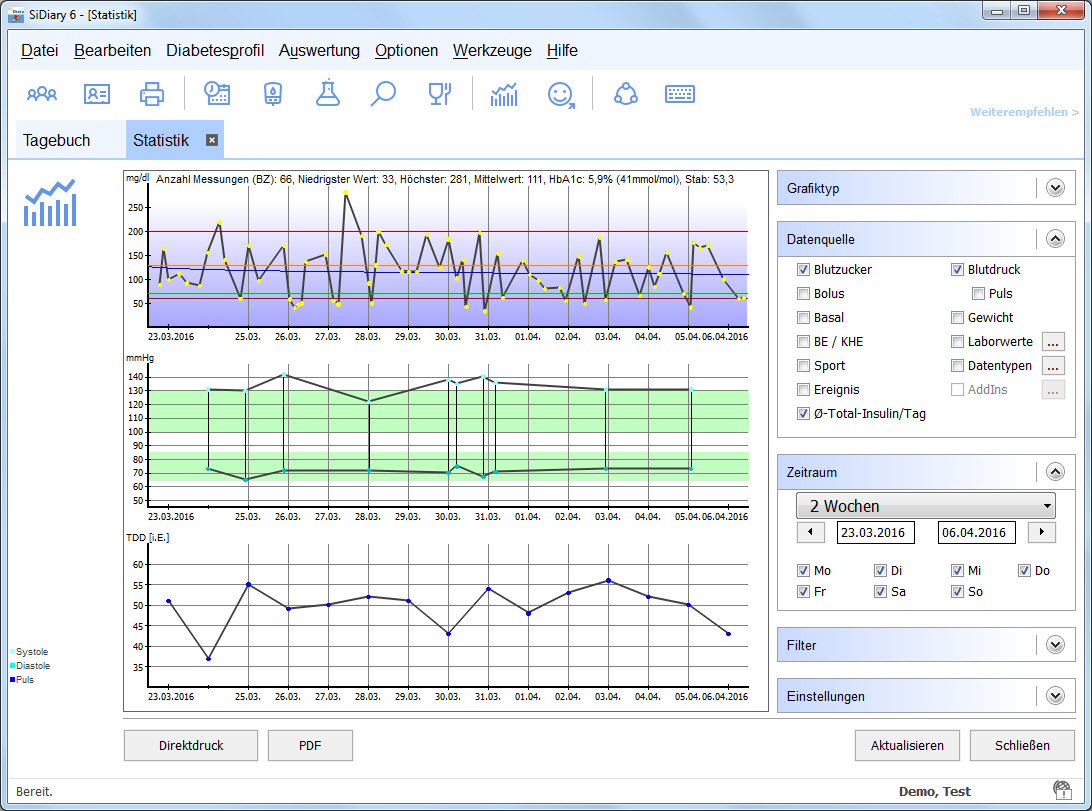 SiDiary Statistik: Verlaufsgrafik Analysieren Sie Ihre eingegebenen Werte mit den detaillierten Statistiken. Sie können unterschiedliche Filter setzen und Auswertungszeiträume einstellen. Die Zeiten für die Filter der Messzeitpunkte (vor Frühstück usw.) können Sie individuell anpassen (Menü Diabetesprofil ⇾ Messzeiten). Die HbA1c-Interpolierung ist nur möglich, wenn Sie in den Profildaten ein Bolusinsulin mit einer Wirkdauer ausgewählt haben. Mit der Option wird der errechnete HbA1c-Wert realistischer und liegt näher an den Laborergebnissen für vergleichbare Zeiträume. Mit den Pfeilsymbolen im Aufklappfenster 'Zeitraum' können Sie den eingestellten Zeitraum um ein gleich großes Intervall verschieben, um z.B. Wochenvergleiche zu ziehen.