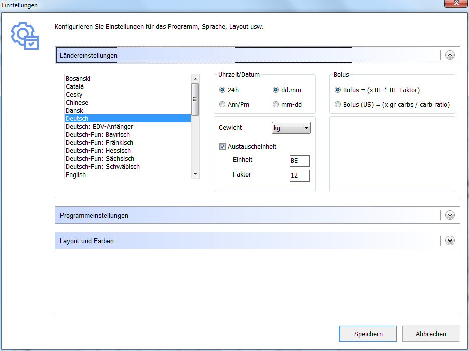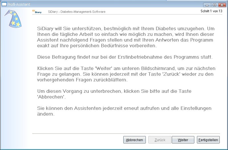SiDiary Diabetestagebuch: Einstellungen Einige Funktionen und Einstellungsmöglichkeiten sind möglicherweise nach der Beantwortung der Profilassistent-Fragen nicht sichtbar. Wenn Sie noch ungeübt im Umgang mit Computern sind, reduziert das Programm automatisch die angezeigten Menüpunkte, um Sie nicht zu verwirren. In der Experteneinstellung haben Sie die volle Funktionsvielfalt mit zusätzlichen Menüeinträgen, um z. B. auch den Speicherort Ihrer Dateien ändern zu können.
