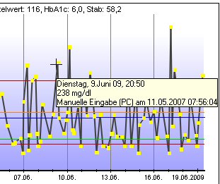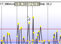Im Verlaufs- und Verteilungs-Diagramm erhalten Sie zu jedem Messpunkt Datum und Uhrzeit und den exakten Messwert als Tooltip-Anzeige, wenn Sie die Maus über die Grafik bewegen.