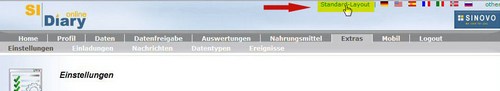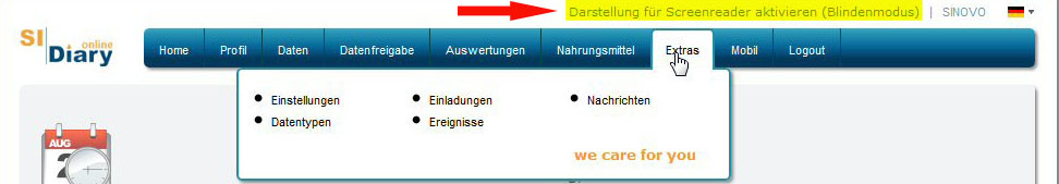Wenn Sie einen Screenreader benutzen (oder auch auf manchen Android Tablets) kann es vorkommen, daß die Untermenüs bei SiDiary Online schwerer zu verwenden sind. (In einem normalen Webbrowser zeigen sie sich, wenn man mit dem Mauspfeil über die Hauptmenüpunkte fährt, siehe Bild unten)
