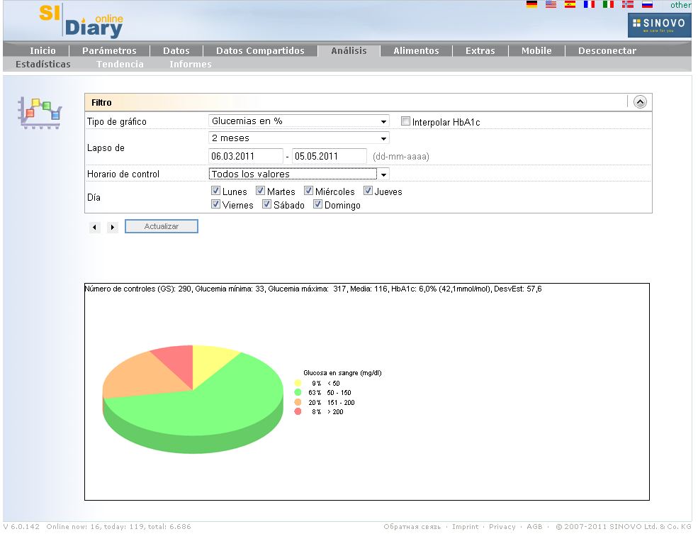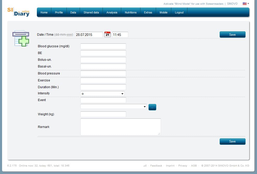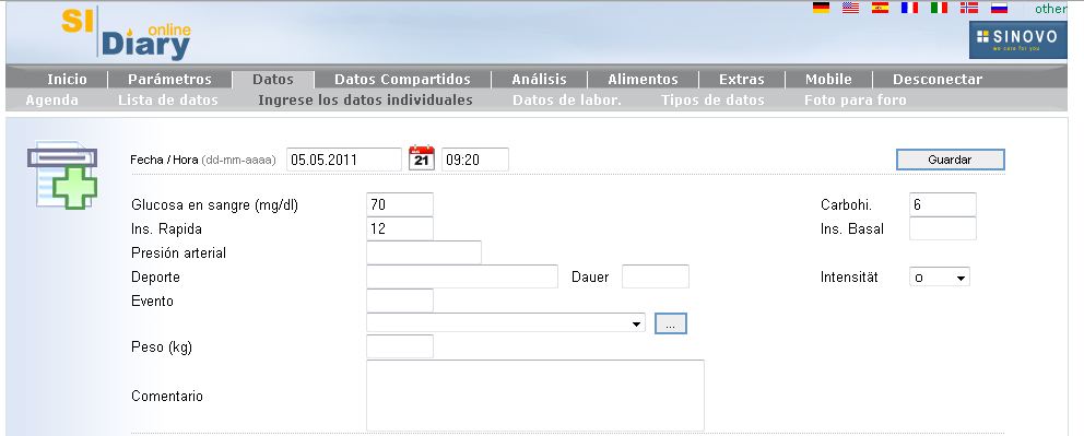 La gestión de tu diabetes se hace más flexible con 'SiDiary Online'. Sólo necesitas un navegador para Internet (por ejemplo, Internet Explorer, Firefox o Safari) para iniciarlo. Con la asistencia de estos navegadores, incluso los usuarios de Linux o Apple pueden beneficiarse fácilmente de SiDiary. 'SiDiary Online' está ahora perfectamente equipado, incluso para los navegadores en los dispositivos móviles (Smartphone, Blackberry, Android o iPhone). El espacio disponible en las pantallas de los dispositivos, es totalmente utilizado. Si lo deseas, puede instalar una cookie que te permite firmarte (log-in) casi automáticamente. Si eliges la plantilla 'Ingresar un dato' como tu pantalla de inicio por defecto, puedes ingresar tus datos desde el inicio de SiDiary Online.
