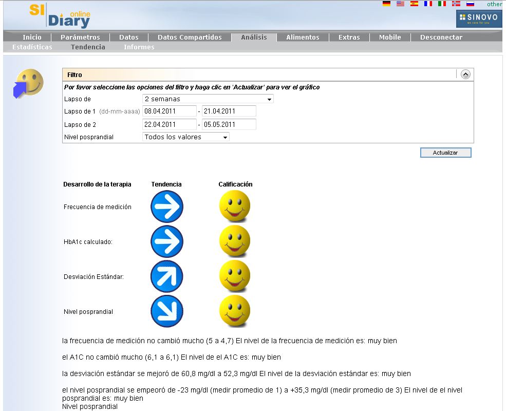 'SiDiary Online' ofrece todas las características que conoces de la versión para PC. Puedes crear un perfil de usuario individual, independientemente del tipo de tu diabetes (tipo 1, tipo 2). El seguimiento de los datos es muy fácil. La mayoría de las funciones de análisis que conoces para Windows o para el Smartphone ya están incluidos en 'SiDiary Online'. Tanto la popular función de tendencia, como el valor calculado de A1c, se encuentran también disponibles en 'SiDiary Online'.